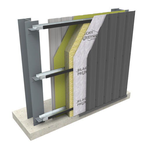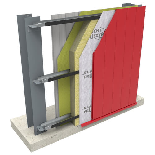 Для відсікання «містка холоду», який утворюється в місці прямого контакту між фасадним профнастилом і стіновим прогоном, в тілі якого буде розташовано утеплювач, на зовнішнє вертикальне ребро прогону монтується самоклейка термопрокладка товщиною 5 мм і шириною 50 мм.