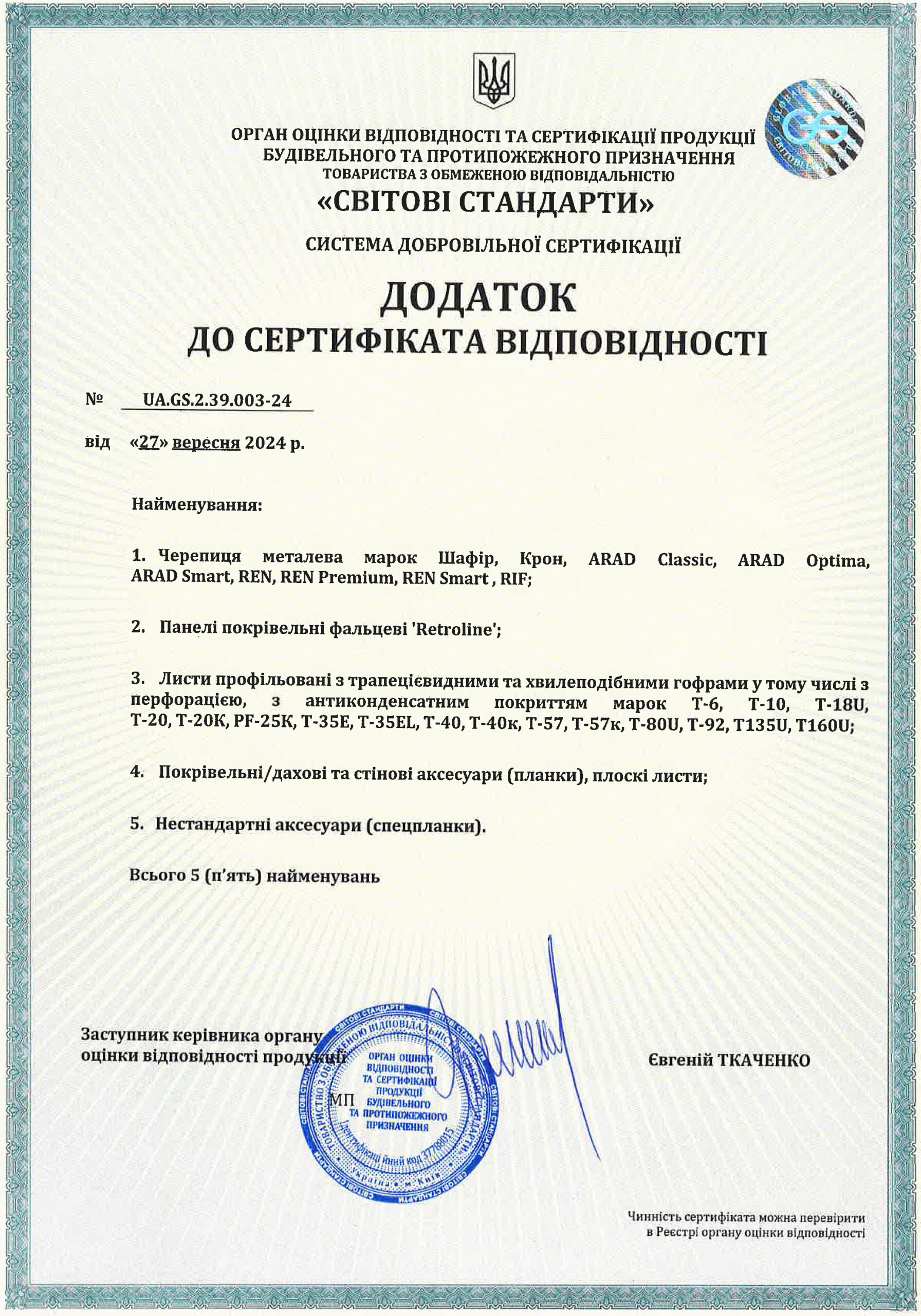 Додаток до сертифікату відповідності на металочерепицю, профнастил, покрівельні панелі RetroLine, покрівельні аксесуари українського виробництва