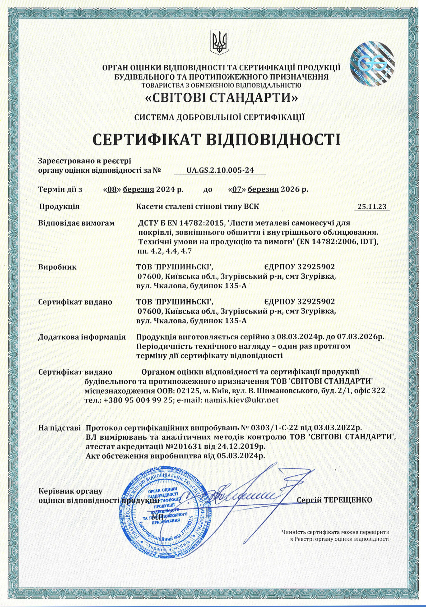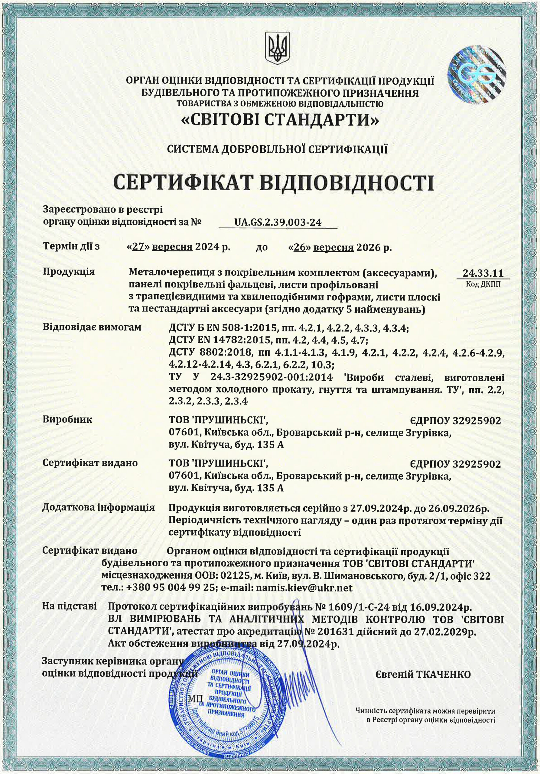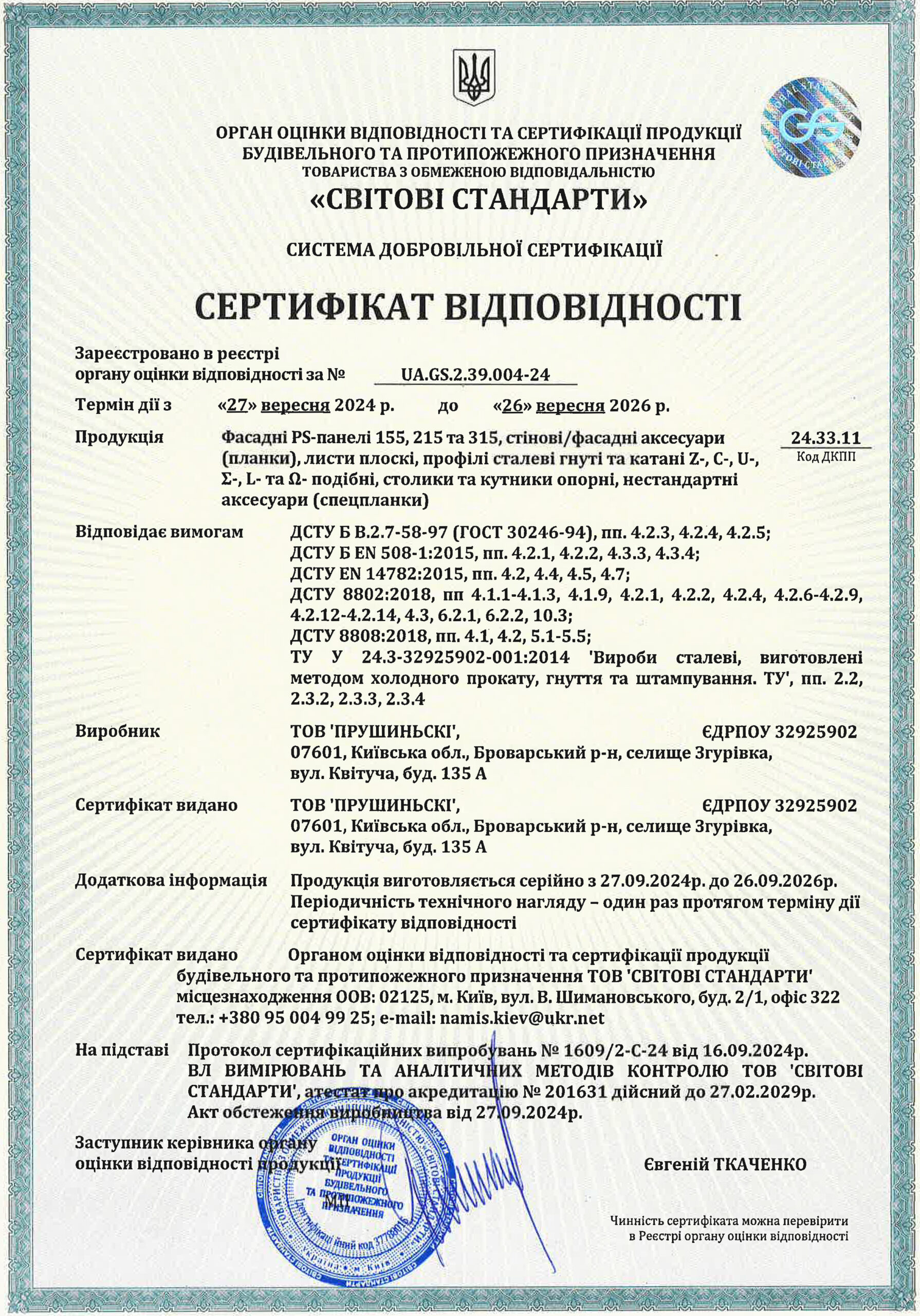 Сертифікат відповідності на фасадні PS-панелі, фасадні аксесуари, профілі сталеві гнуті і катані Z, C, Σ, Ω, U, L, столики і кутники опорні, нестандартні аксесуари українського виробництва