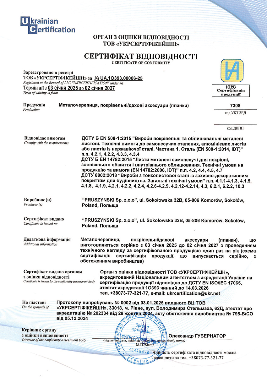 Сертифікат відповідності на металочерепицю та покрівельні аксесуари польського виробництва
