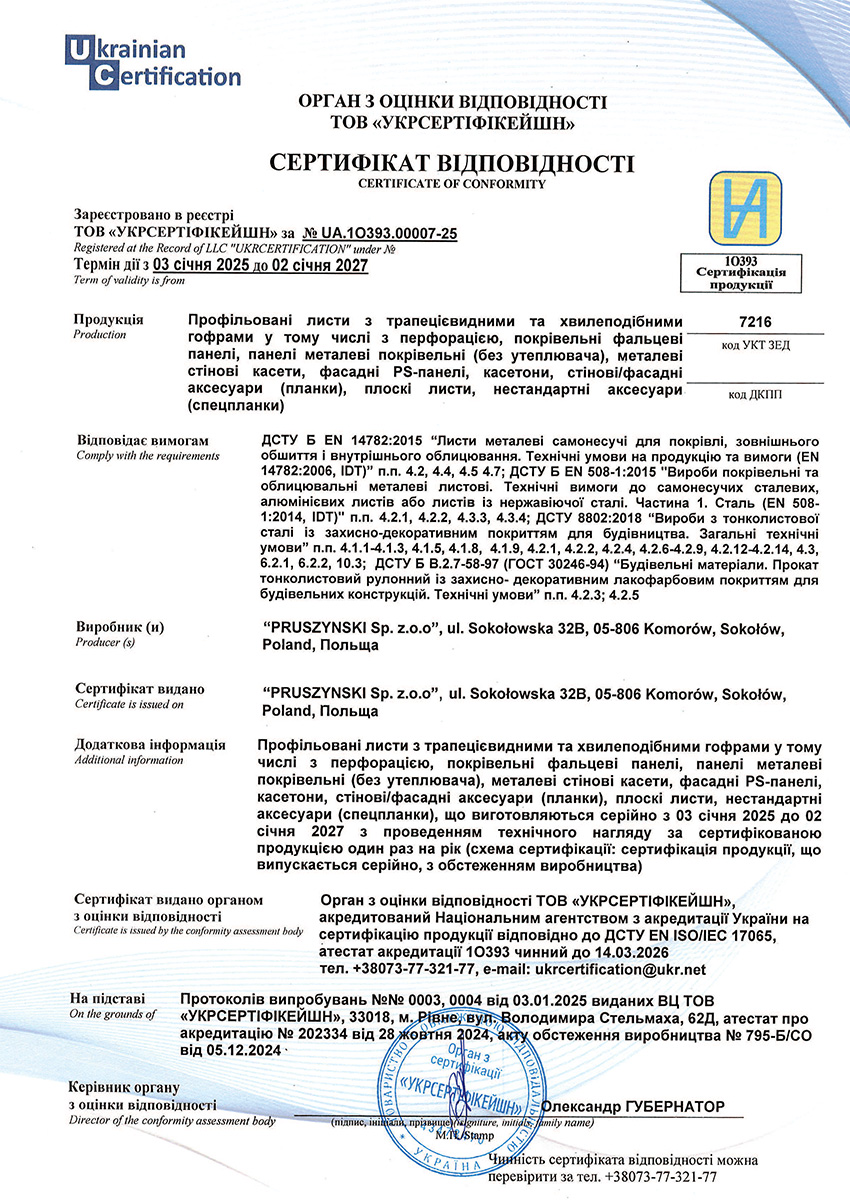 Сертифікат відповідності на профнастил трапецієподібний і хвилястий, стінові касети, покрівельні фальцеві панелі, фасадні PS–панелі і касетони польського виробництва