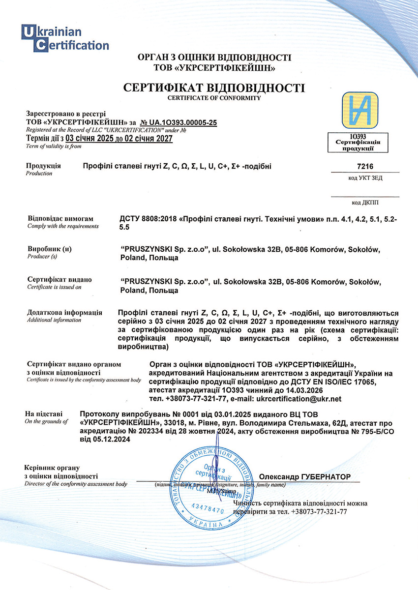 Сертифікат відповідності на профілі сталеві гнуті типу Z, C, Ω, Σ польського виробництва