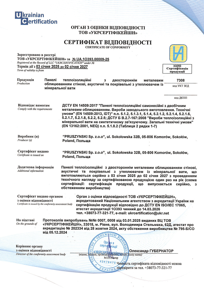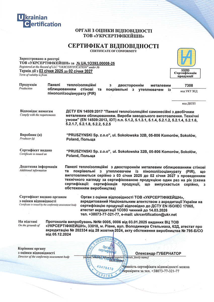 Сертифікат відповідності на сендвіч-панелі стінові та покрівельні з утеплювачем з пінополізоціанурата (PIR)