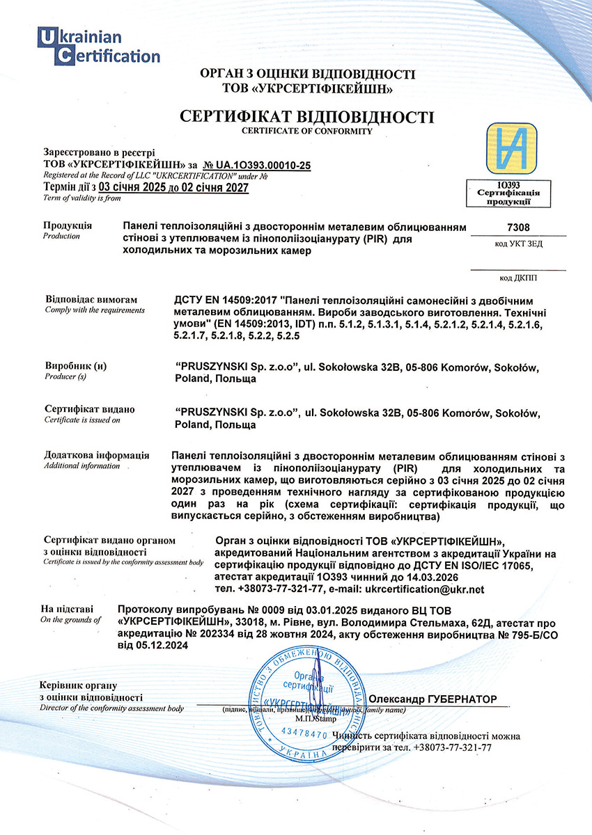 Сертифікат відповідності на сендвіч–панелі стінові та покрівельні з утеплювачем з пінополізоціанурата (PIR) для холодильних і морозильних камер