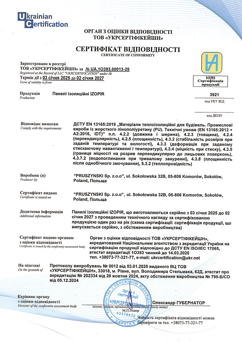 Сертифікат відповідності на сендвіч-панелі IZOPIR з утеплювачем із пінополізоціанурата