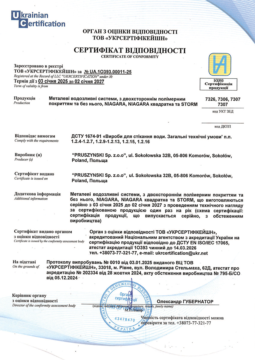 Сертифікат відповідності на металеві водостічні системи Niagara і Storm польського виробництва