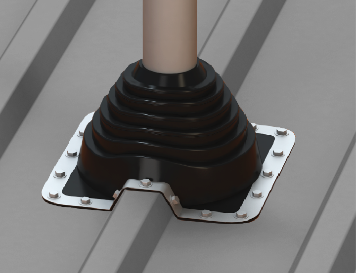 Сфера застосування: ущільнювачі покрівельних виходів застосовуються на покрівлі з металочерепиці та профнастилу для герметизації виходів труб димарів, камінів, систем вентиляції, електровиходів, антен, щогл тощо.