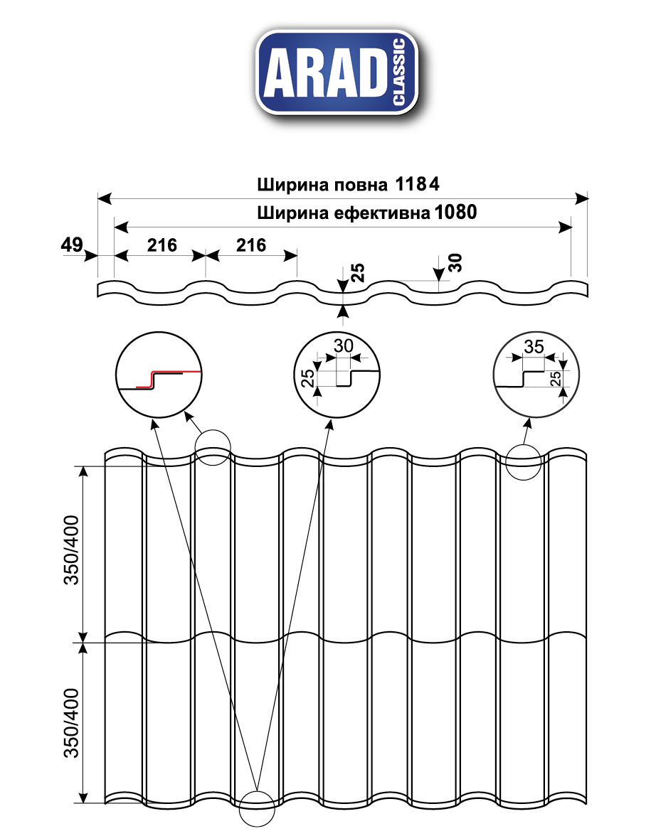 Металочерепиця АРАД Класік має симетричні замки і може укладатися з будь-якого боку, а також із зсувом на хвилю. Це дозволяє розташовувати замки «від входу» і зменшує ймовірність того, що поздовжній стик металочерепиці стане помітним на даху під час експлуатації.