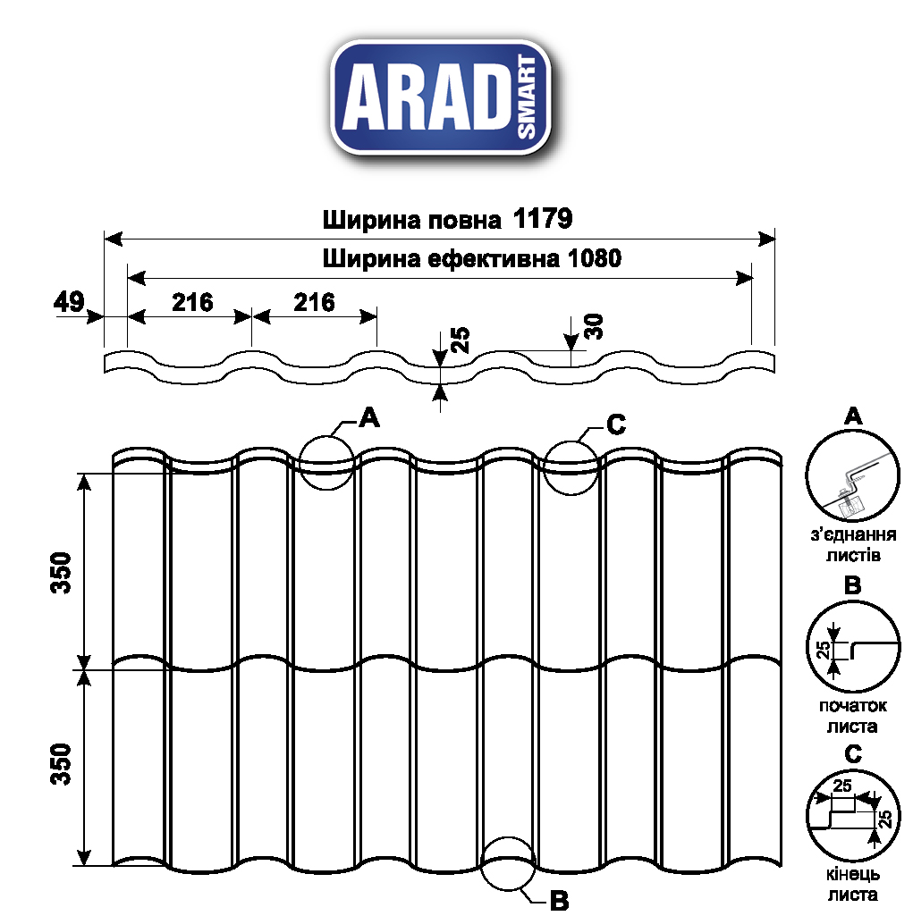Модульна металочерепиця ARAD Smart має оригінальний вигляд натуральної черепиці середземноморського стилю. Досягається такий ефект за рахунок великої висоти штампа 30 мм і загальної висоти профілювання — 55 мм. Завдяки цьому покрівля з металочерепиці ARAD Smart набуває вираженої рельєфності, виразності, а будинок з таким покриттям виглядає елегантно. Нижній край цієї металочерепиці обрізаний по хвилі. Завдяки цьому на покрівлі не видно стики модулів між собою, покрівля виглядає монолітно. Арад Смарт має симетричні замки, тому може укладатися при монтажі на покрівлі в будь-якому напрямку. Довжина тайла металочерепиці складає 350 мм.