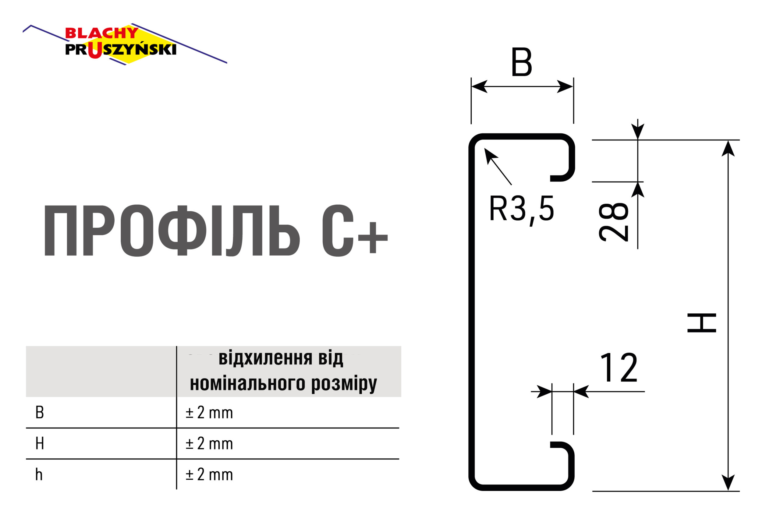 Холоднокатаний сталевий профіль C+ (C plus) – це концептуальний розвиток профілю C, який має таку ж основну форму. Крім того, за допомогою ширших смуг до країв додано характерні «вуса». Це спеціальні вигини, які збільшують несучу здатність та жорсткість виробу, що дозволяє досягти подібних параметрів навіть з трохи тоншими смугами. Завдяки точності виготовлення та масштабу вигинів, прогони C+ виготовляються з листового металу з (гарячеоцинкованої листової сталі марки S350 GD) товщиною максимум 2,5 мм. Стандартних довжин немає, максимальна L = 13600 мм.