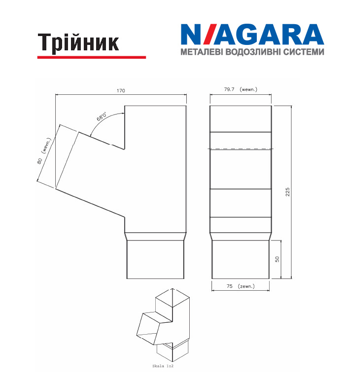 Компанія «Прушиньскі» випускає квадратні зливні системи NIAGARA розміром 125/80 мм з двосторонньо оцинкованої сталі (цинкове покриття 275 г/м2) найвищої якості, товщиною 0,6 мм, яку покрито з двох сторін захисним шаром поліуретанової фарби товщиною 50 мк (колір RAL7016 i RAL9005). Метал з цим покриттям має високу стійкість до корозії, механічних пошкоджень та знебарвлення.