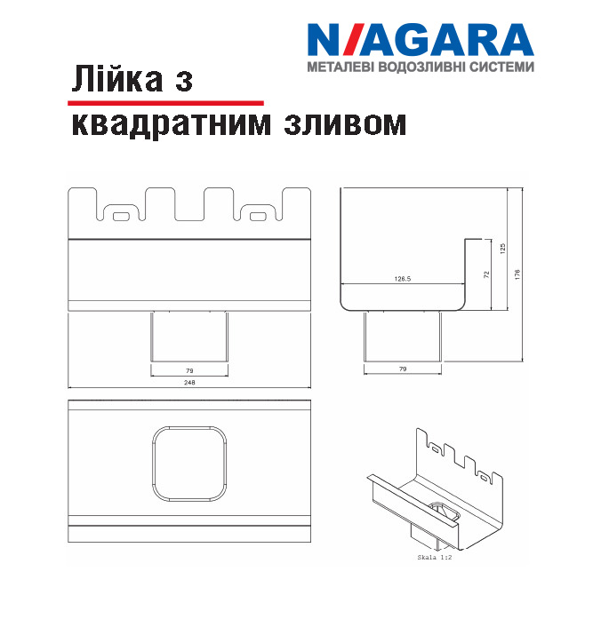 Компанія «Прушиньскі» випускає квадратні зливні системи NIAGARA розміром 125/80 мм з двосторонньо оцинкованої сталі (цинкове покриття 275 г/м2) найвищої якості, товщиною 0,6 мм, яку покрито з двох сторін захисним шаром поліуретанової фарби товщиною 50 мк (колір RAL7016 i RAL9005). Метал з цим покриттям має високу стійкість до корозії, механічних пошкоджень та знебарвлення.