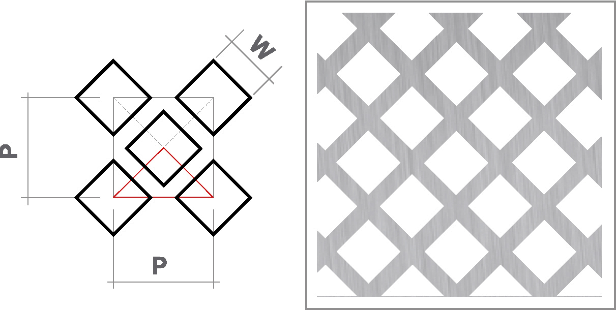 Перфоровані листи з квадратними отворами, розташованими в шаховому порядку під кутом 45º, виготовляються з металу найвищої якості. Перфорація виконується машинним способом з дуже високим ступенем точності, що гарантує 100% відповідність вашому замовленню.