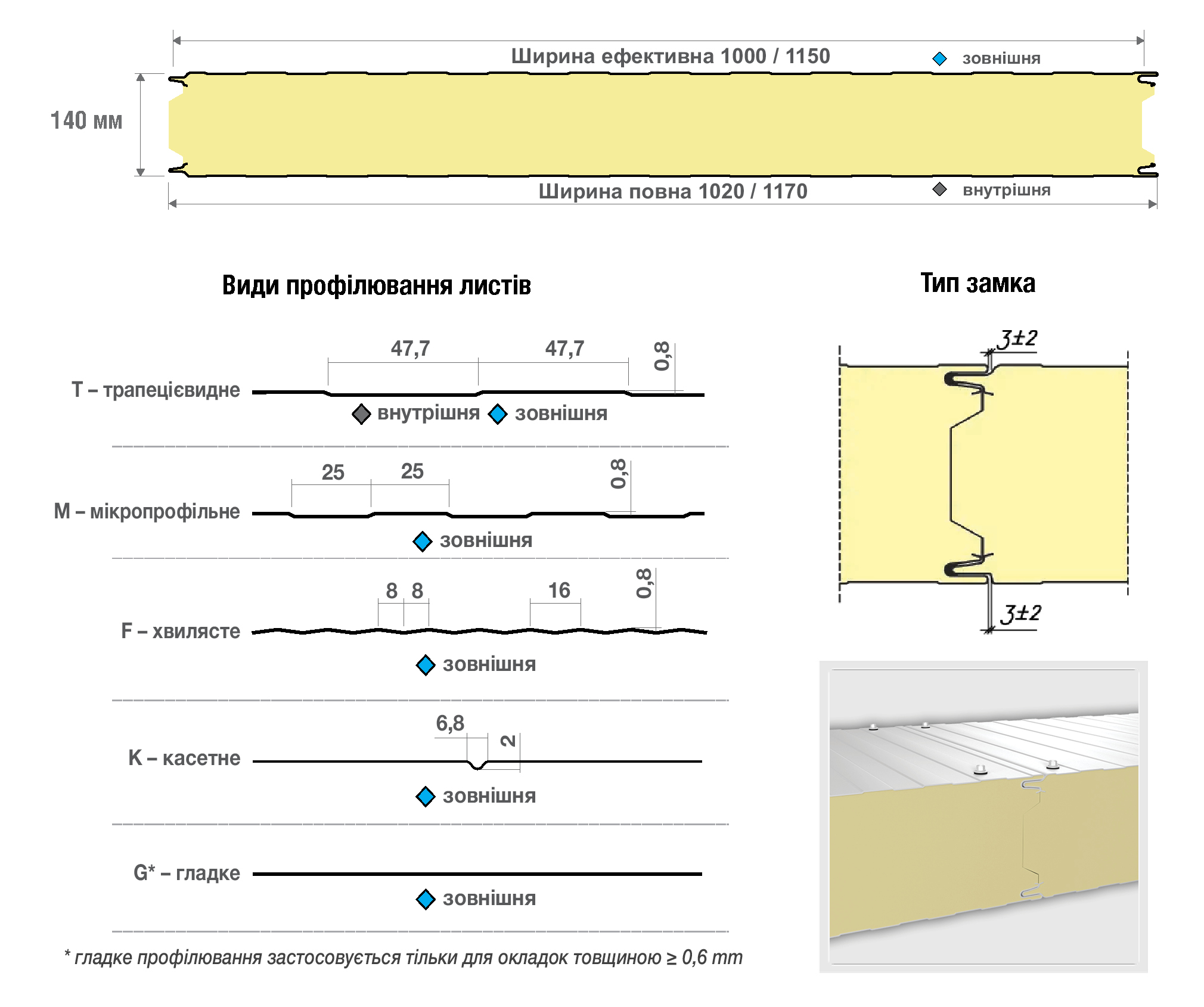 • європейського металу – зовнішній лист товщиною 0,5 мм (можлива товщина металу 0,40–0,70 мм) і внутрішній лист 0,45 мм (можлива товщина металу 0,40–0,70 мм);
