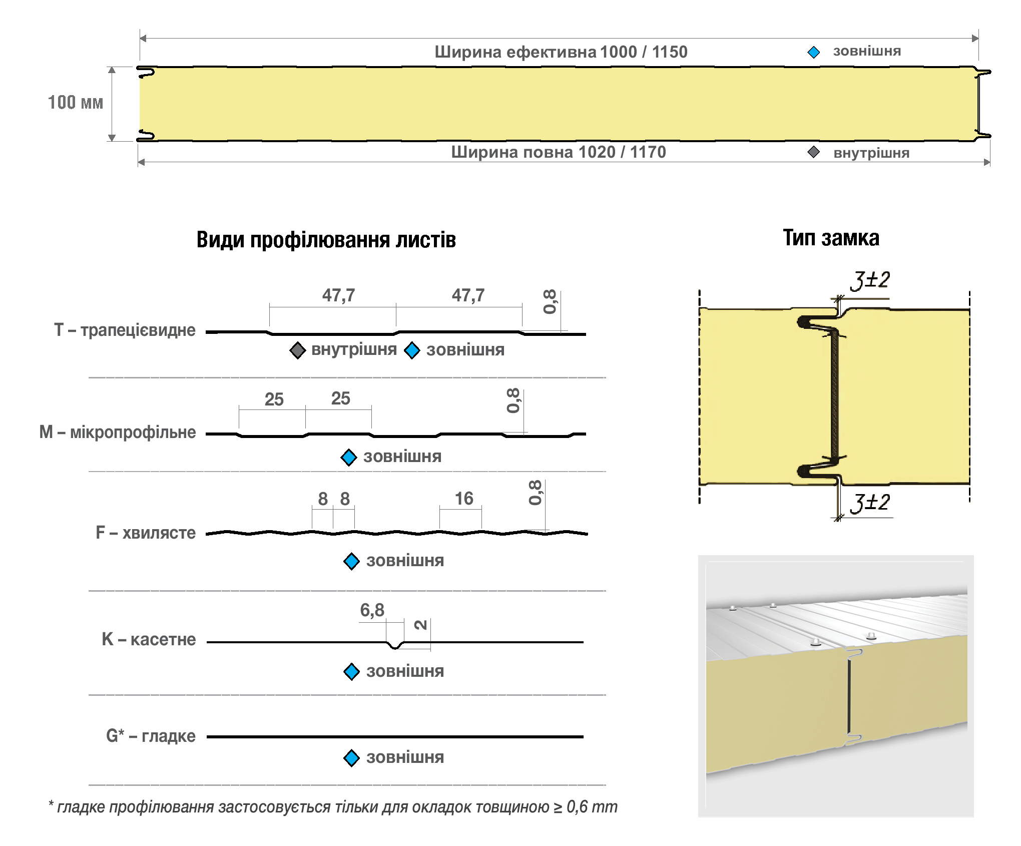 • зовнішнє – T-трапецієвидне, М-мікро, F-хвилясте, К-касетне, G-гладке (на замовлення);