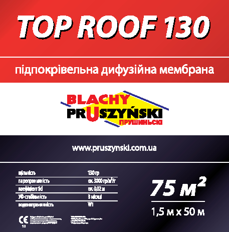 Супердифузійна мембрана TOP ROOF 130 виробляється в Німеччині, упакована у фірмову упаковку «Прушиньскі», що брендована логотипом компанії по всьому полотну.