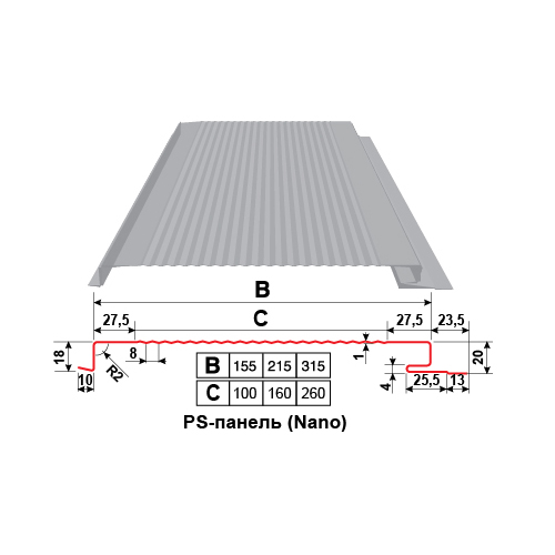 Компанія «Прушиньскі» виробляє два види PS-панелей — пласкі (P) та з Nano-профілюванням (Nano) — які мають ширину дзеркала панелі (В) 155, 215 та 315 мм з металу товщиною 0,5 (довжина панелі від 1,4 до 6 м) і 0,7 мм (довжина панелі від 1,4 до 8 м).