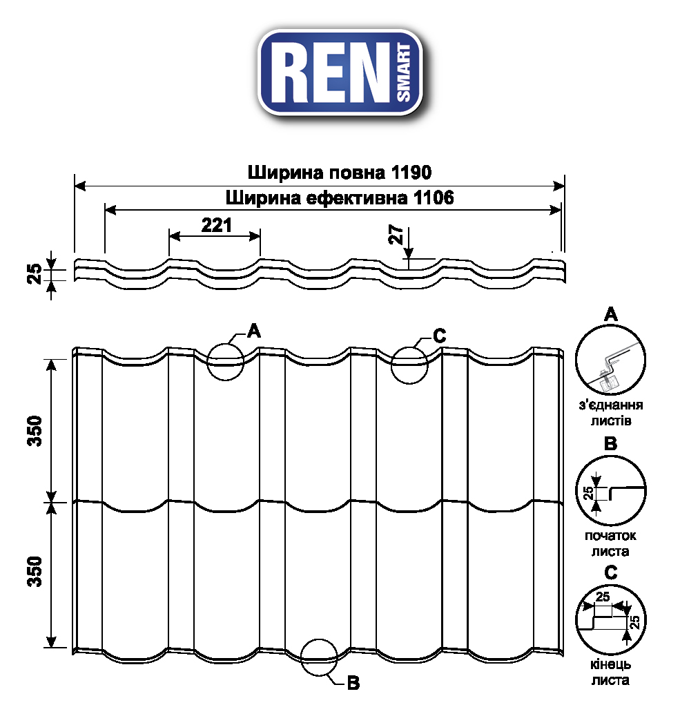 Модульна металочерепиця REN Smart задовольнить потреби найвибагливіших клієнтів, які шукають нетрадиційний та стильний, але в той же час довговічний та якісний покрівельний матеріал. РЕН Смарт — металочерепиця з унікальною формою сходинки (її висота 25 мм) і новою для наших споживачів геометрією профілювання.