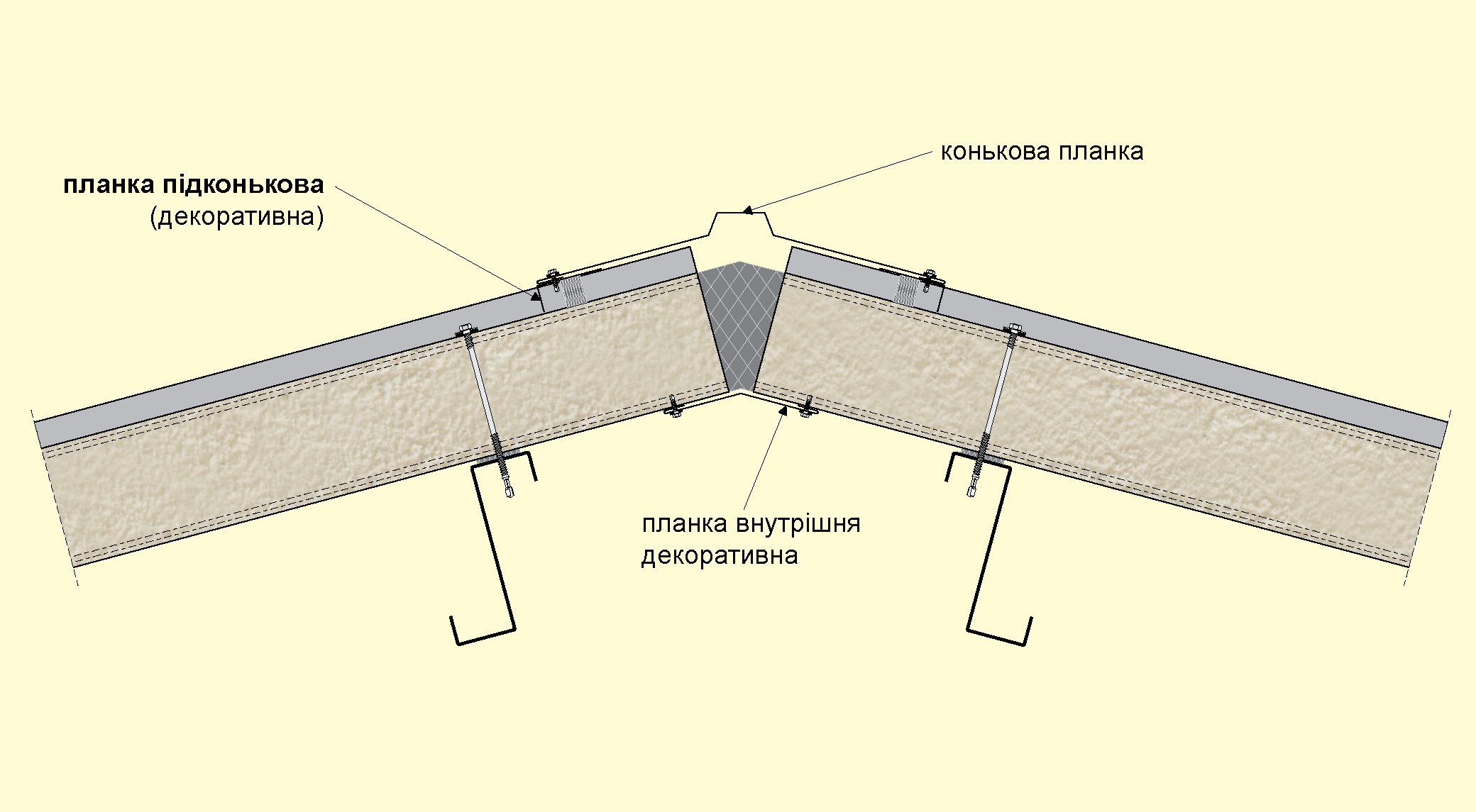 Підконькова планка є декоративним елементом, що забезпечує додатковий захист верхньої частини покрівельного покриття від проникнення вологи й вітру та естетичний вигляд зони під коньком даху, змонтованого із покрівельних сендвіч-панелей PIRTECH.