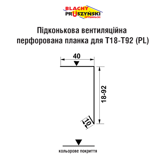 Підконькова вентиляційна перфорована планка призначена тільки для використання з нашими профнастилами Т18-Т92  (висотою від 18 до 92 мм) польського виробництва. Вона не підходить для монтажу з металочерепицею, фальцевими панелями та іншим покрівельним покриттям нашого виробництва.