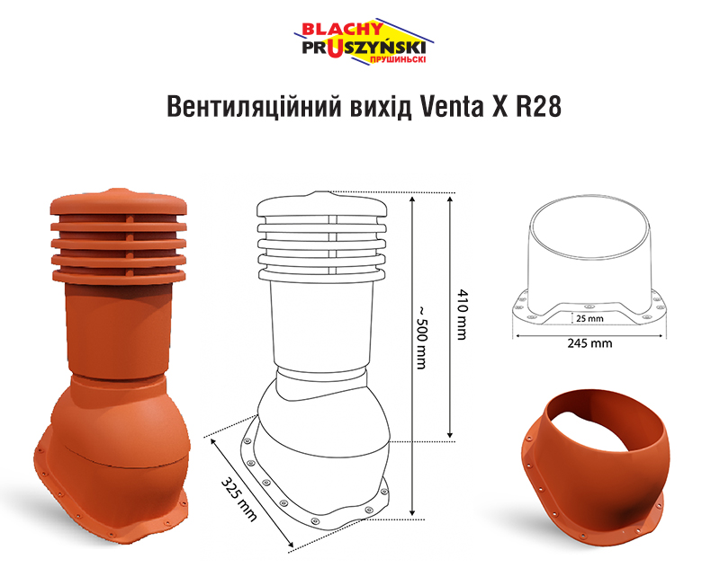 Удосконалений вентиляційний вихід Pruszynski Venta X R28 з вентиляційним перетином 170 мм та діаметром 150 мм, виготовлений із високоякісного пластика. Має основу для кріплення вентвиходу на металочерепиці (ARAD i REN) з профілюванням R28, що запобігає попаданню дощової води у вентиляційний канал. Регулювання кута нахилу від 5° до 45°.