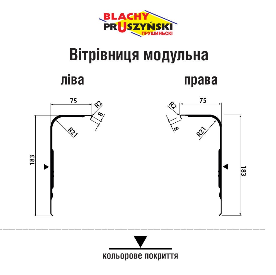 Модульна вітрівниця є декоративним елементом ската покрівлі для майже всіх типів модульної і класичної металочерепиці “Прушиньскі”. Призначення модульної вітрівниці, як і інших вітрових планок – це герметизація покрівлі та підвищення її стійкості до сильних поривів вітру (особливо бокового), а також захист від особливо сильних опадів.