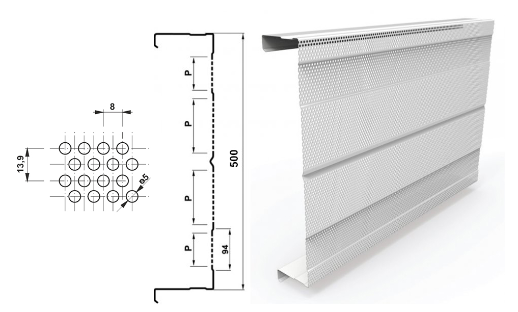 Компанія “Прушиньскі” пропонує виготовлення внутрішніх стінових касет із перфорацією різних типів і конфігурацій. Перфорація виконується на високоточному обладнанні, що забезпечує ідеальну геометрію отворів та стабільну якість по всій поверхні касети. Перфоровані внутрішні стінові касети, як правило, застосовується при будівництві будівель для виробництв і приміщень з підвищеним рівнем шуму. При наявності перфорації на внутрішньому шарі касет їхня поверхня не буде повністю відображати звук всередину приміщення (цеху), навпаки, звукові хвилі проходитимуть крізь отвори в шар утеплювача, волокна якого прекрасно гасять звукові хвилі. Утеплювач в цьому випадку є звукопоглинальним матеріалом, знижуючи рівень шуму всередині приміщення. ВСК виробляються зі сталі марки S250 + 275Zn товщиною 0,7 до 1,5 мм. Довжина стінової перфорованої касети – від 2 до 13,6 м.