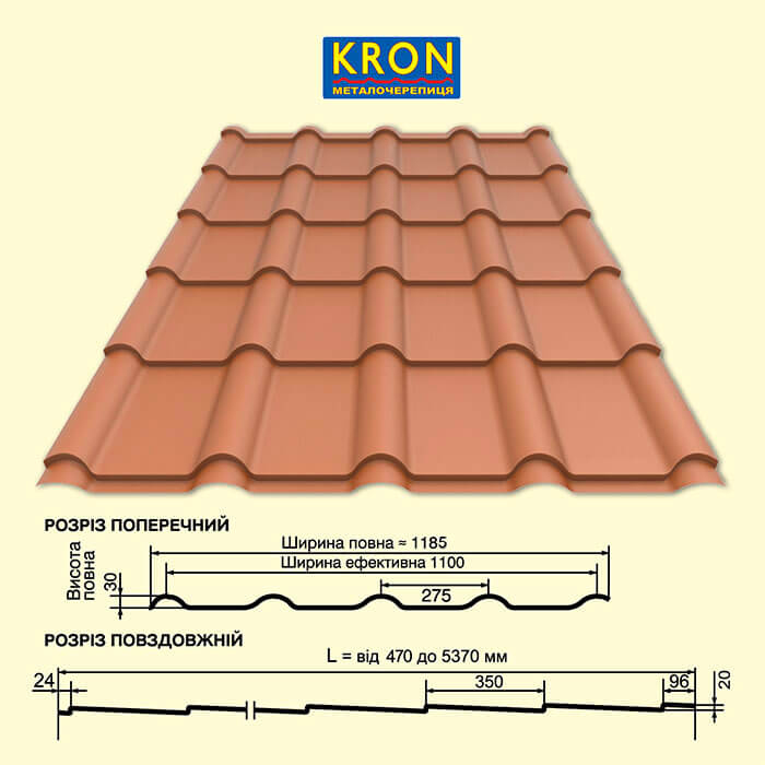 ТОВ «Прушиньскі» пропонує два види металочерепиці Крон: з довжиною тайла 350 мм і 400 мм. Глибина штампування для кожного виду складає відповідно 15 і 20 мм. Крон 400 виглядає особливо привабливо на покрівлях з великими розмірами скатів.