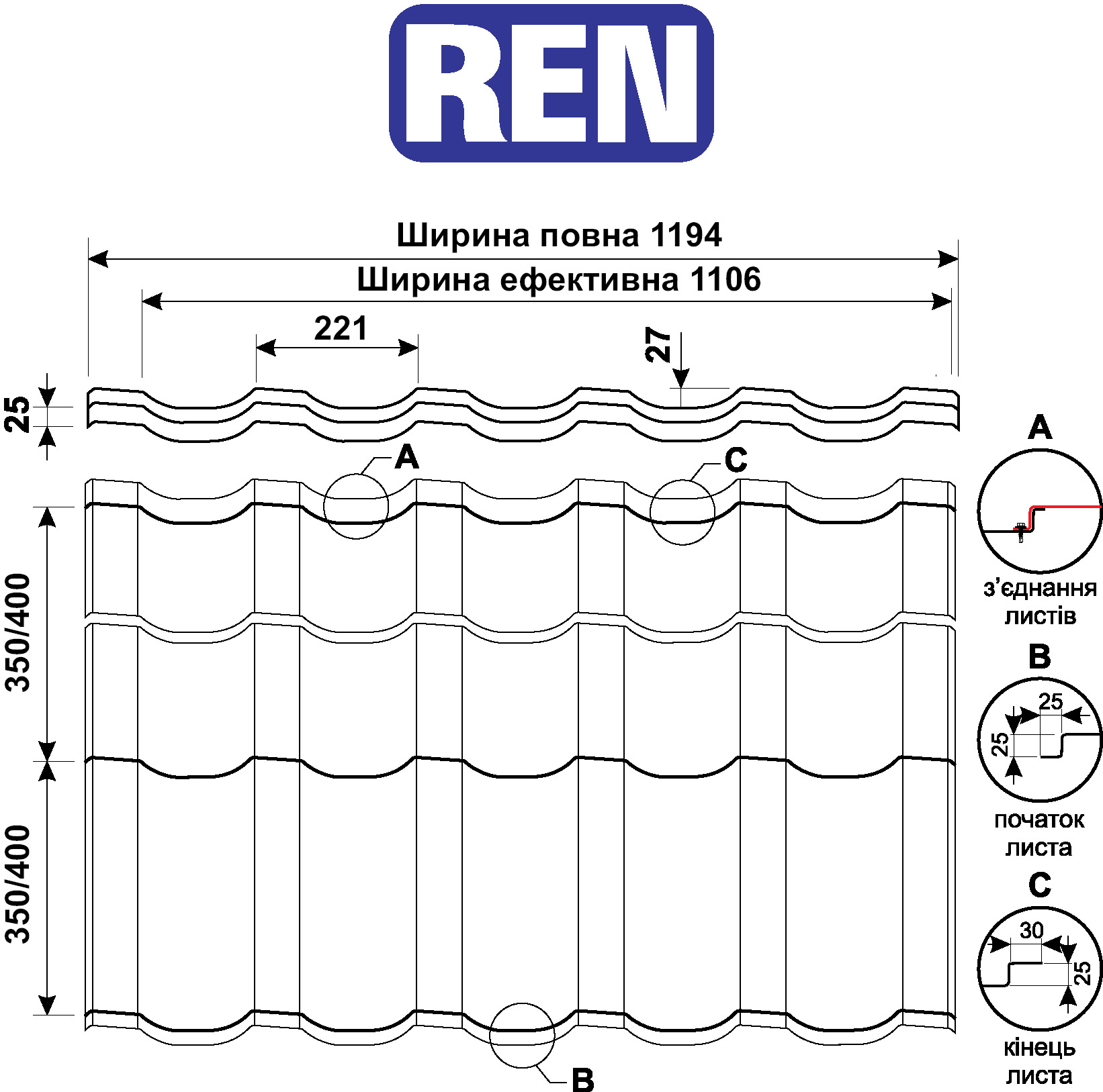 Металочерепиця REN симетрична, що спрощує її монтаж, так як листи можна укладати як зліва-направо, так і справа-наліво.