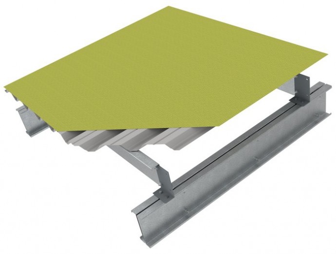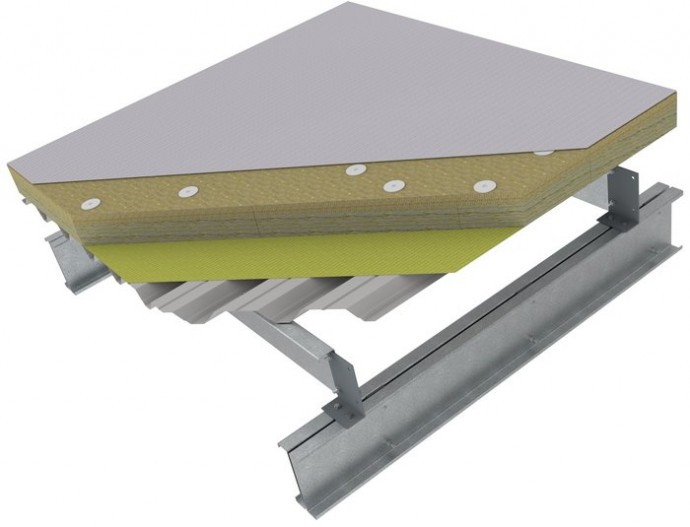 Конструкція «утепленої» пласкої покрівлі є тришаровим «пирогом», що складається з нижнього (несучого) профнастилу, утеплювача (мінеральна вата) і верхнього зовнішнього покриття.