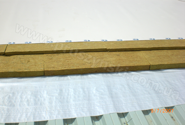 Вибір зовнішнього елемента «теплої» покрівельної конструкції (метал або рулонний матеріал) визначається проектним рішенням і є основоположним при підборі щільності утеплювача, так як при використанні рулонного матеріалу саме плитковий утеплювач сприймає розподілене і точкове навантаження на покрівлю і передає її несучому профнастилу, тому утеплювач повинен бути «жорстким», щільністю не менше 145кг/м2 (у випадку застосування двошарового утеплення покрівлі допускається використання нижнього шару більш м’якого). Такий тип покрівельної конструкції називається «м’яка» покрівля (фото 3). Мінімальний ухил такої покрівлі в окремих випадках може бути 0о.
